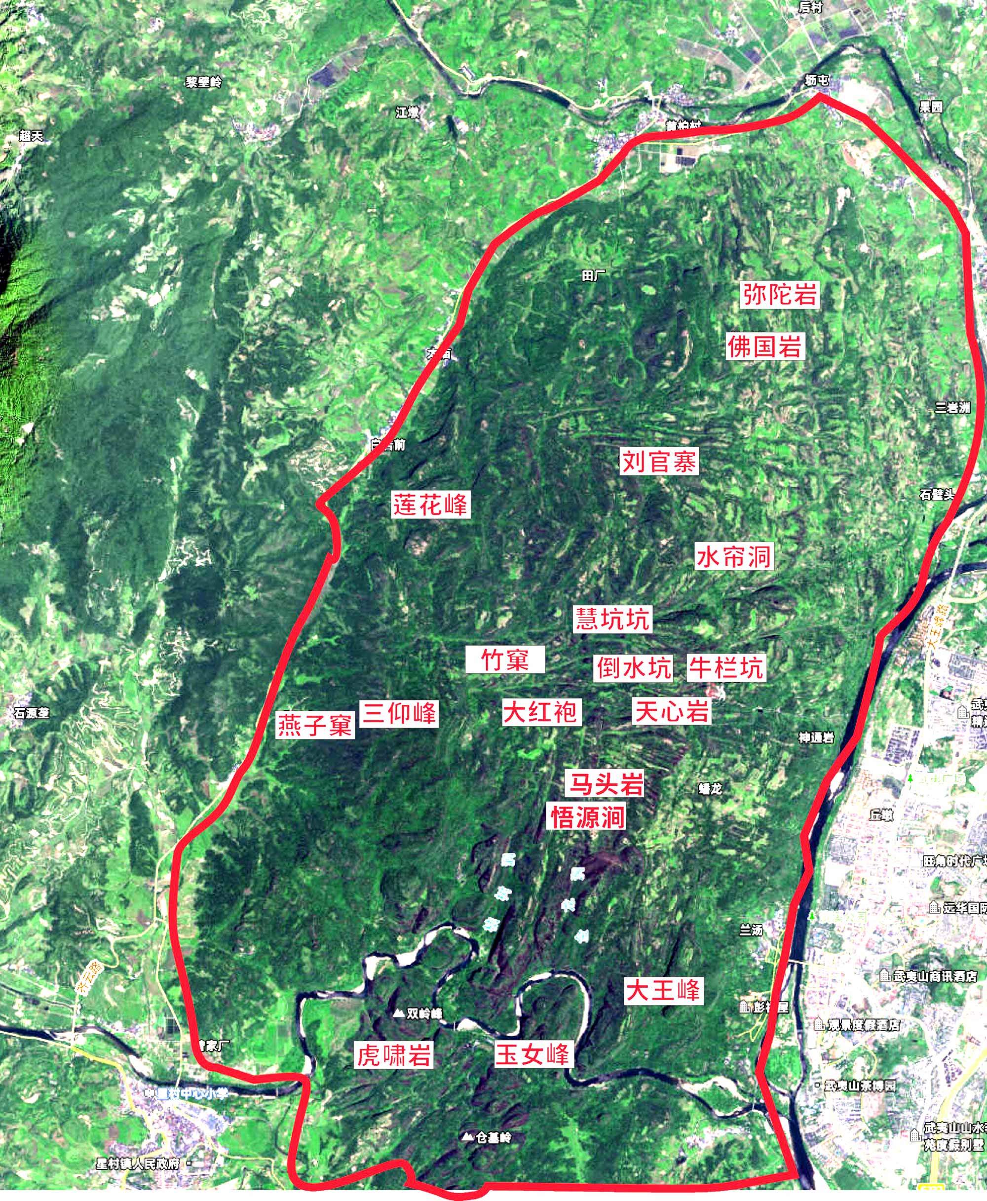 红色圈内是正岩的 武夷岩茶正岩核心山场示意图,大概位置标注。
